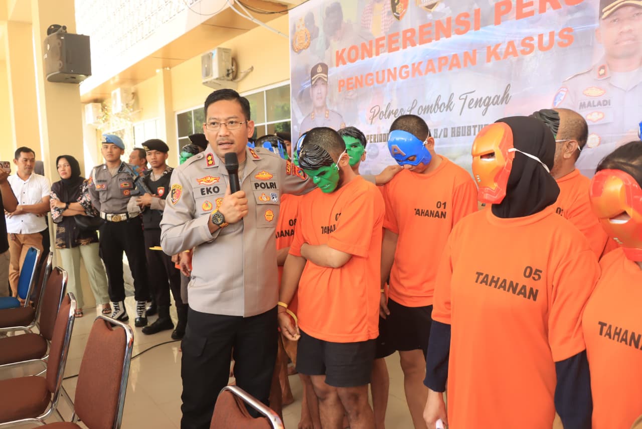 Lombok Tengah (ntbupdate.com) – Polres Lombok Tengah melakukan sebuah langkah unik dan bermakna, para tersangka aksi kriminalitas dihadirkan di hadapan publik dengan mengenakan topeng pahlawan super saat konferensi pers, Rabu (3/9).